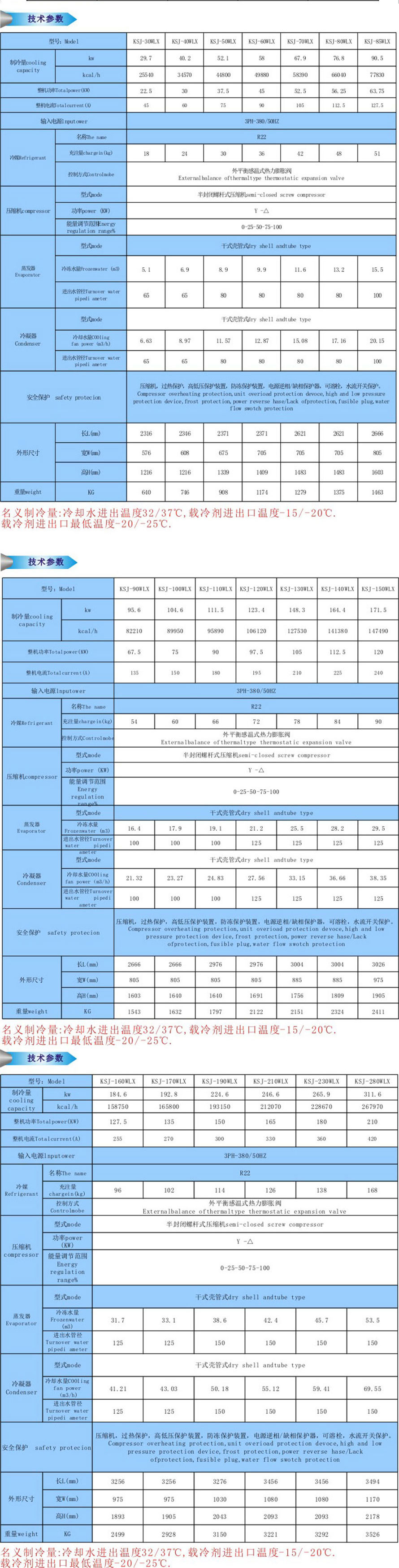 可提供-5℃~-35℃低溫載冷劑;制冷量范圍12KW-2000KW。載冷劑可為乙二醇或氯化鈣水溶液(蒸發器防腐設計)。