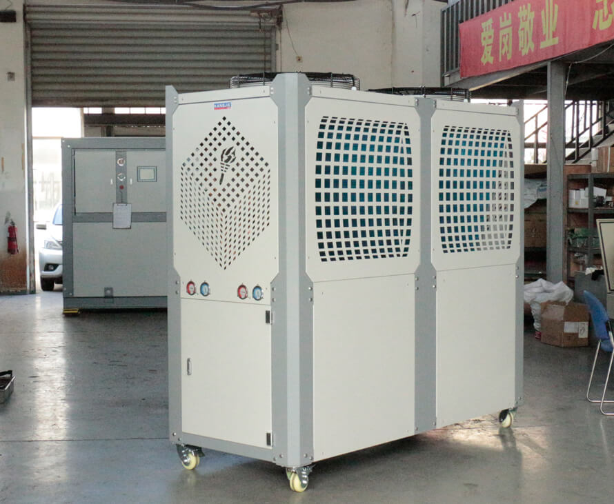 5、風(fēng)冷式工業(yè)箱式制冷機組;通過風(fēng)扇以空氣作為冷凝方式的冷水機;
